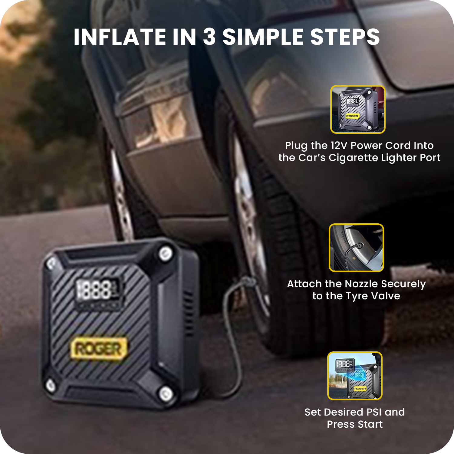ROGER Smart Tyre Inflator | Dual Mode (Battery & Car 12V Port)