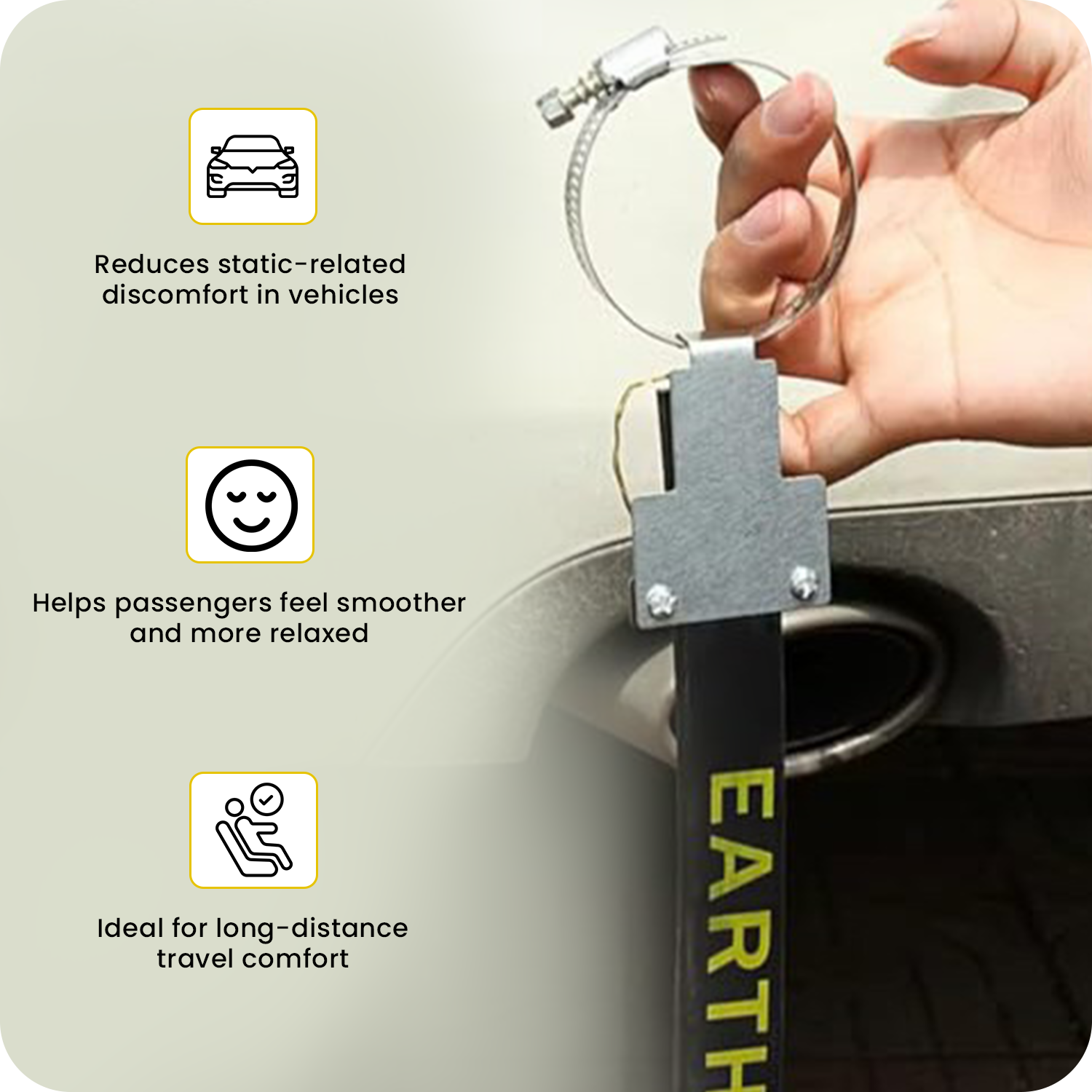 Ideal for passengers prone to motion sickness, the strap helps stabilize electrostatic conditions inside the car, making the ride smoother and more pleasant.