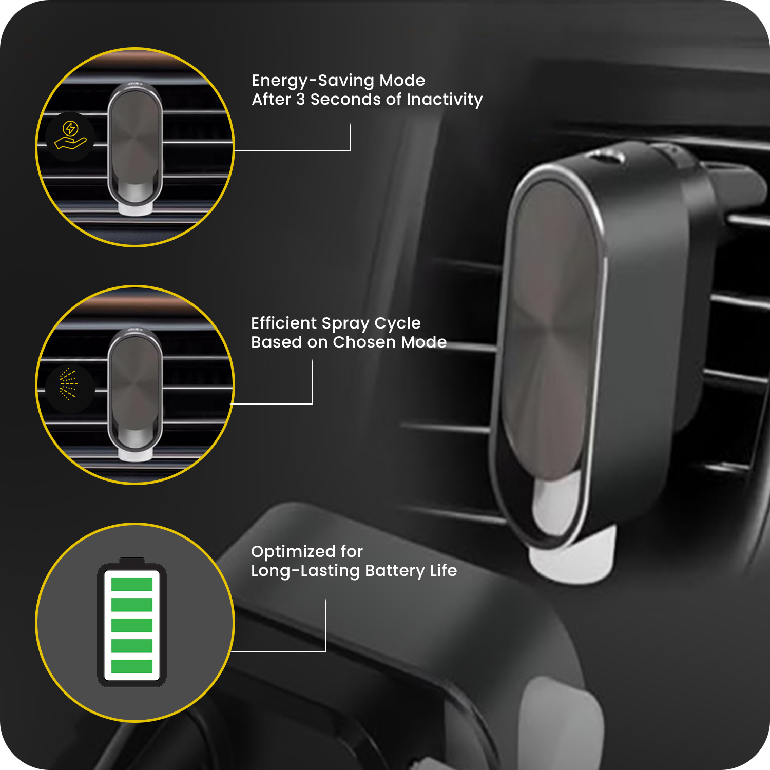 The diffuser automatically activates when the car is in motion and shifts to standby mode after 60 seconds of inactivity—hands-free and hassle-free operation.