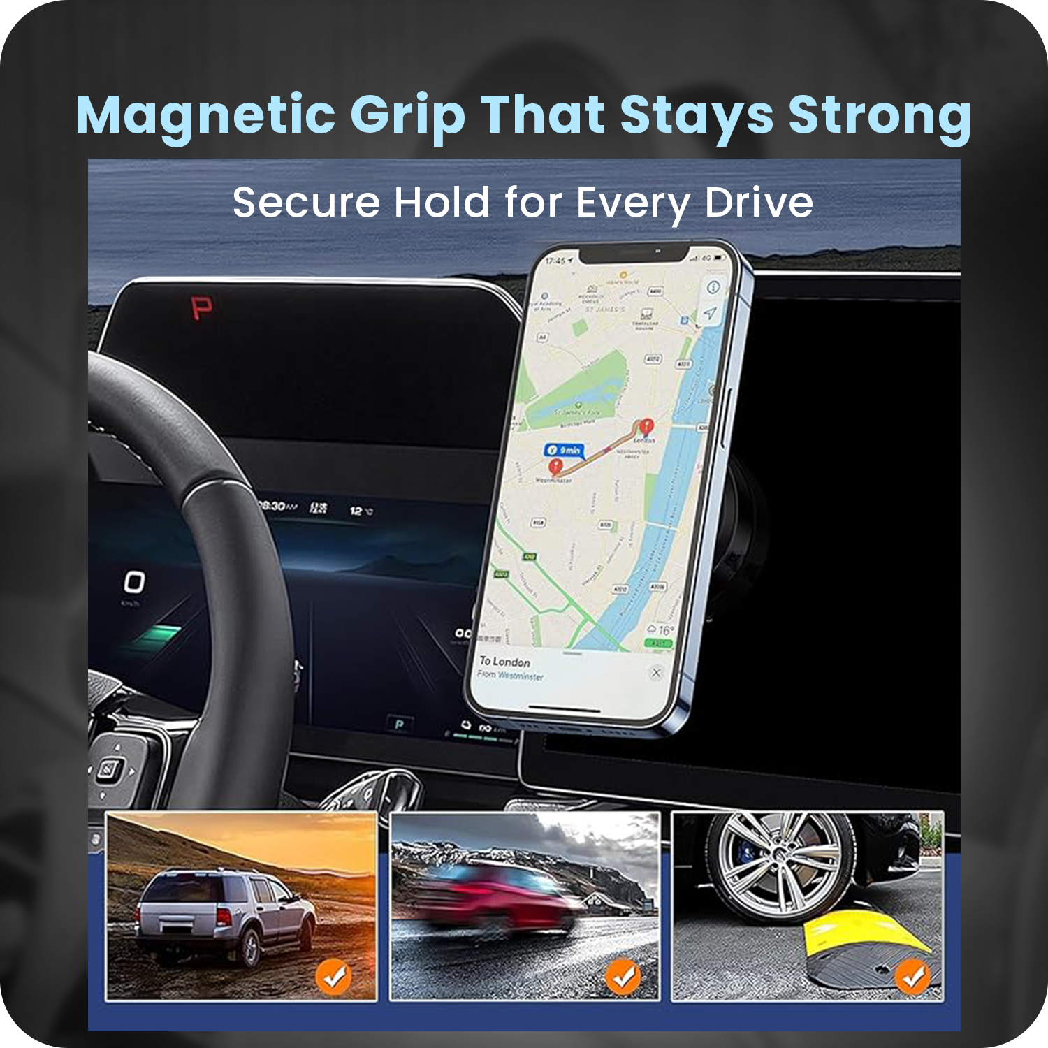Powerful magnetism ensures your phone stays locked in place—even during sharp turns, sudden stops, or rough terrain.