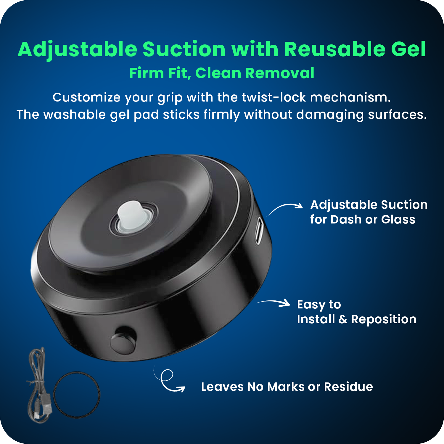 Customize your grip with the twist-lock mechanism. The washable gel pad sticks firmly without damaging surfaces.