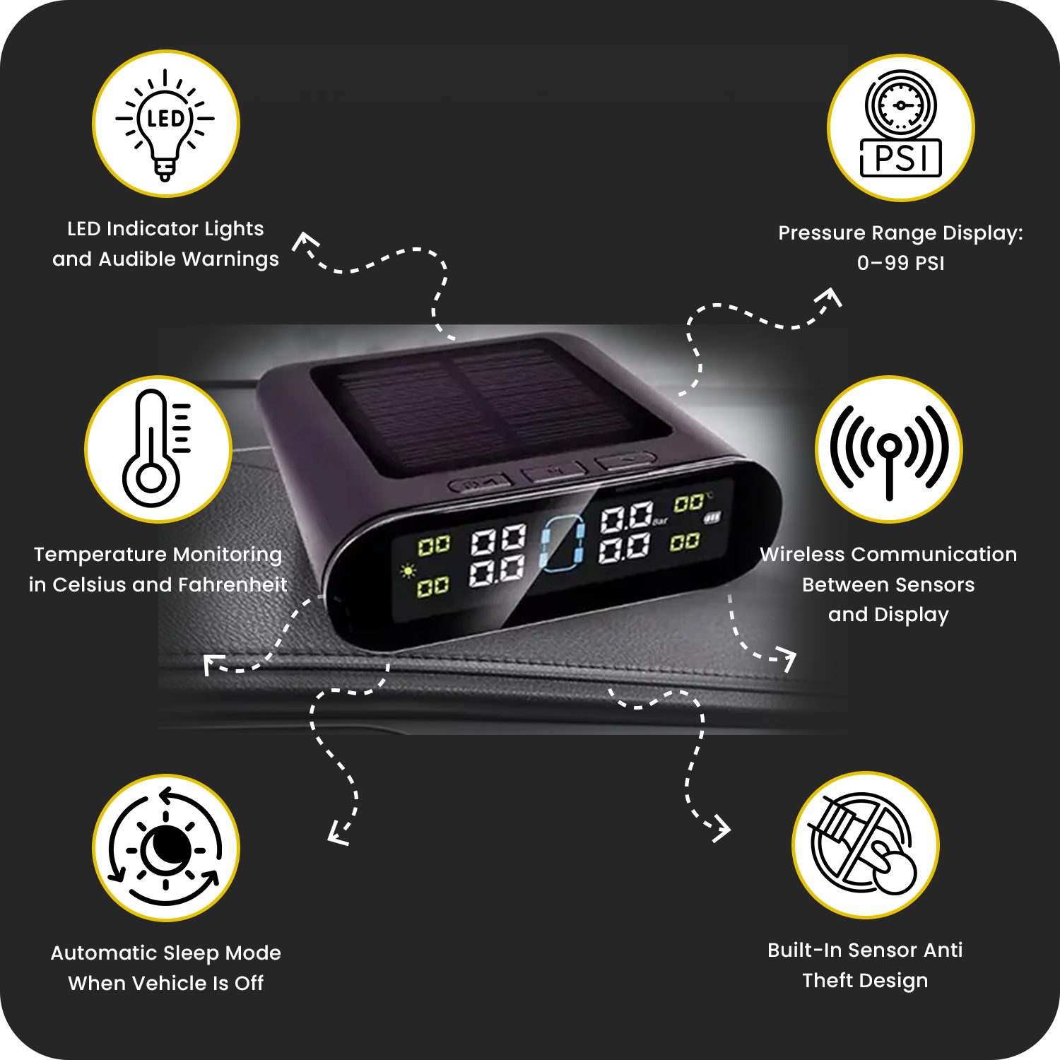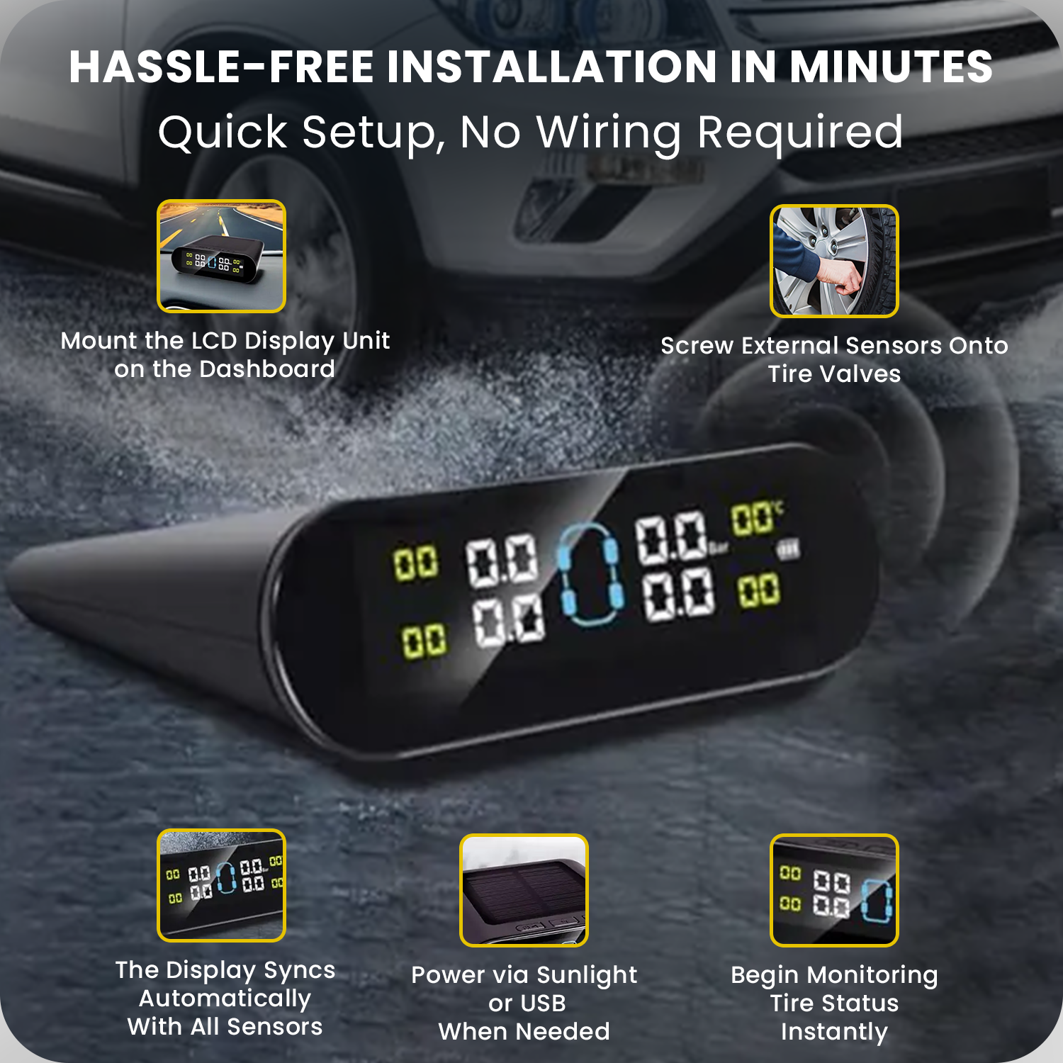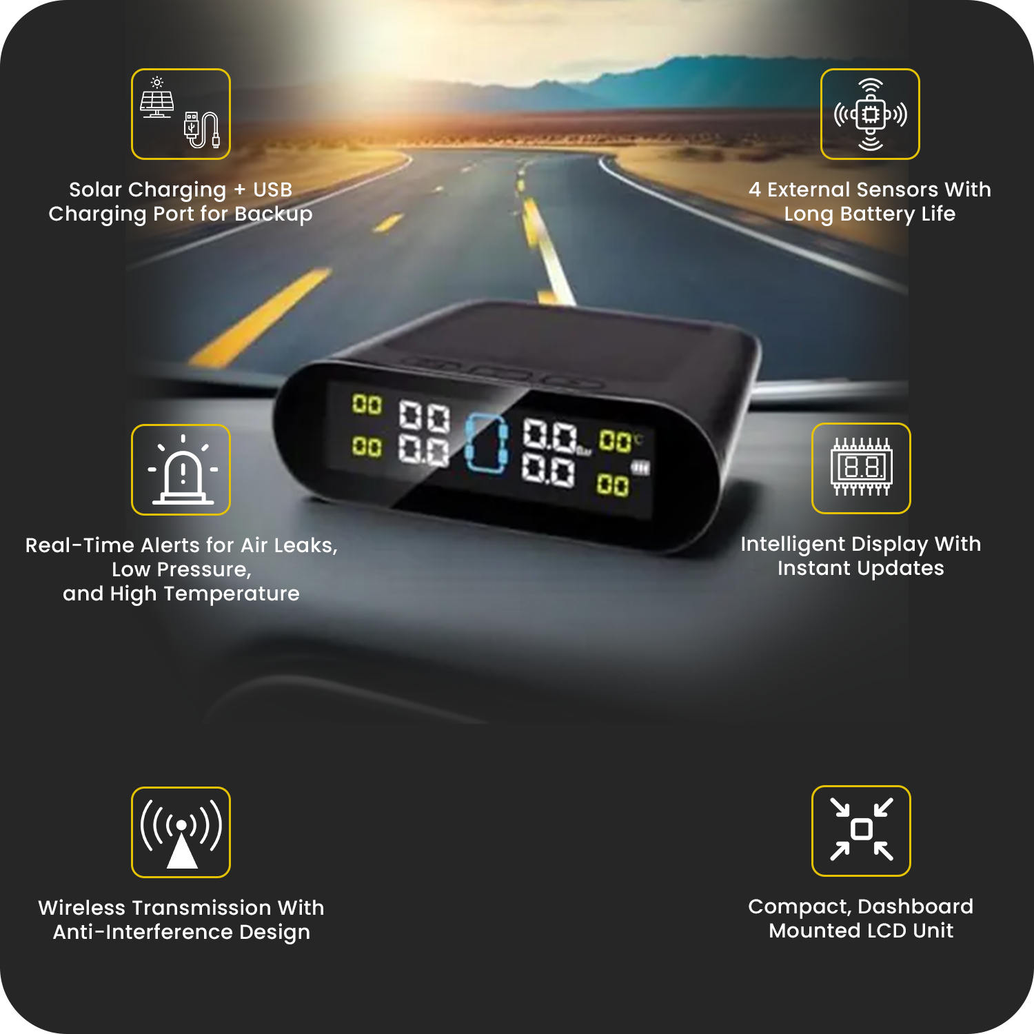 Powered primarily by solar energy, the system is energy-efficient and low-maintenance. For cloudy or low-light days, the USB port provides backup charging, ensuring your TPMS is always ready to go.