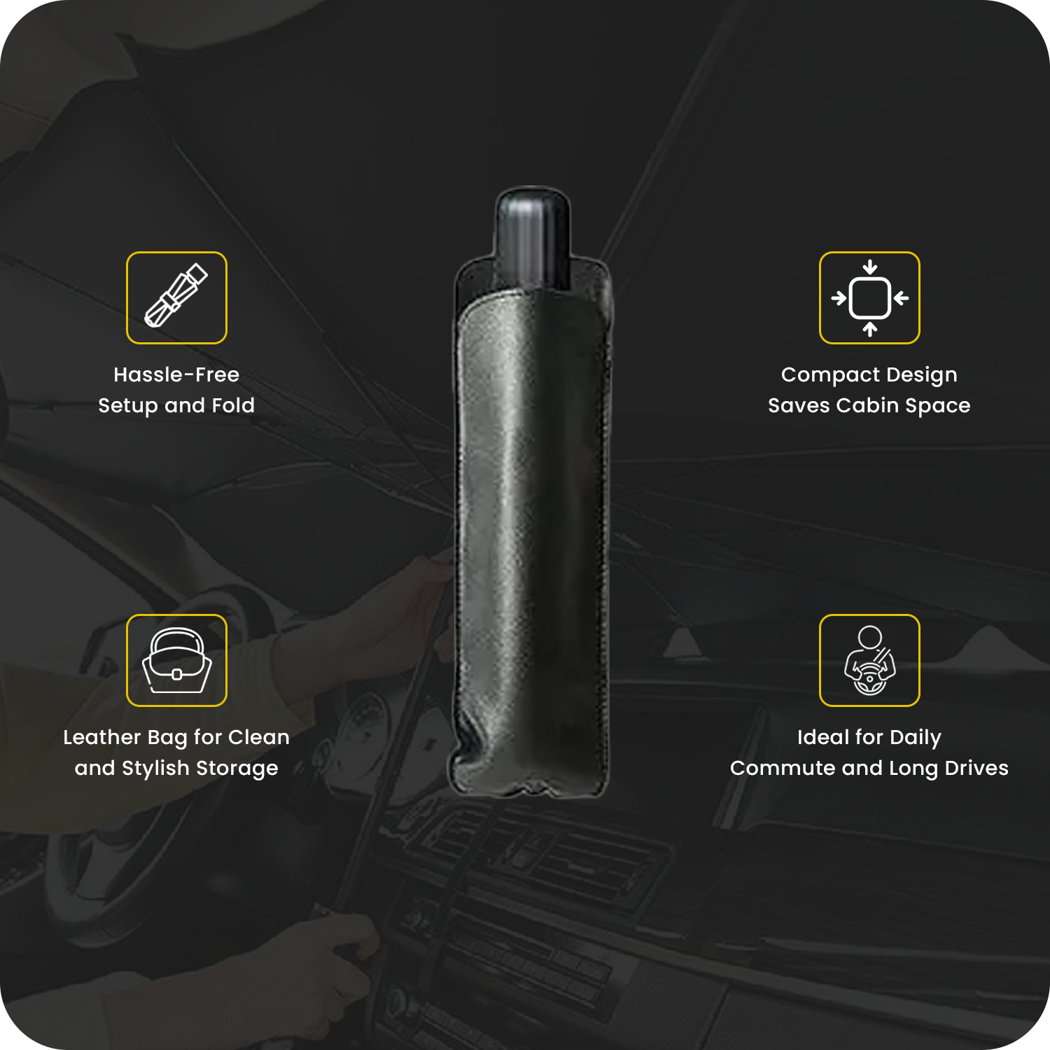Designed for everyday convenience, this foldable umbrella opens and closes effortlessly. It comes with a premium leather storage pouch, saving space and keeping your car neat and organized.