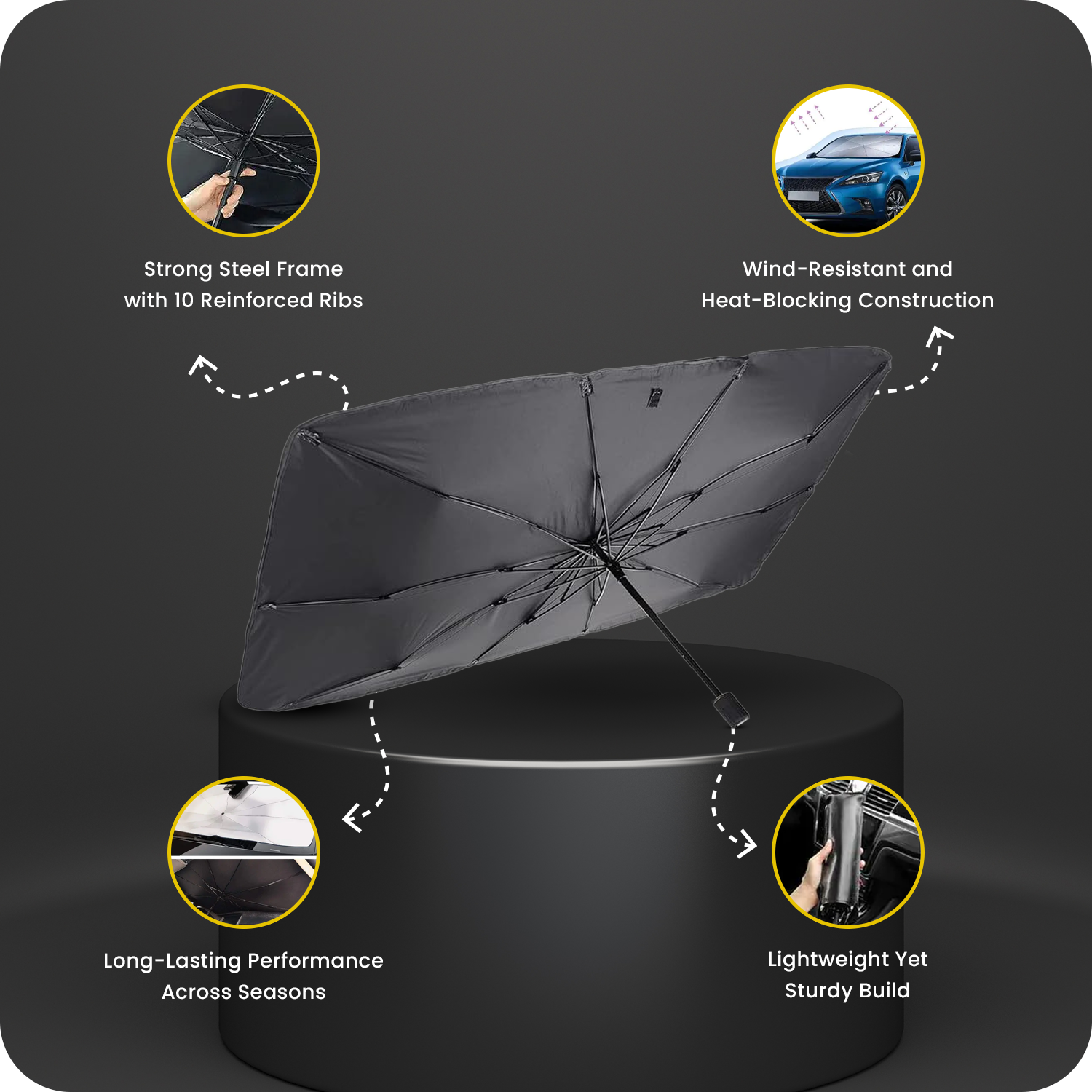 Crafted with high-hardness steel and 10 reinforced ribs, it offers stable support and long-lasting use. Effectively blocks UV rays and heat, ensuring a cooler and more comfortable cabin.